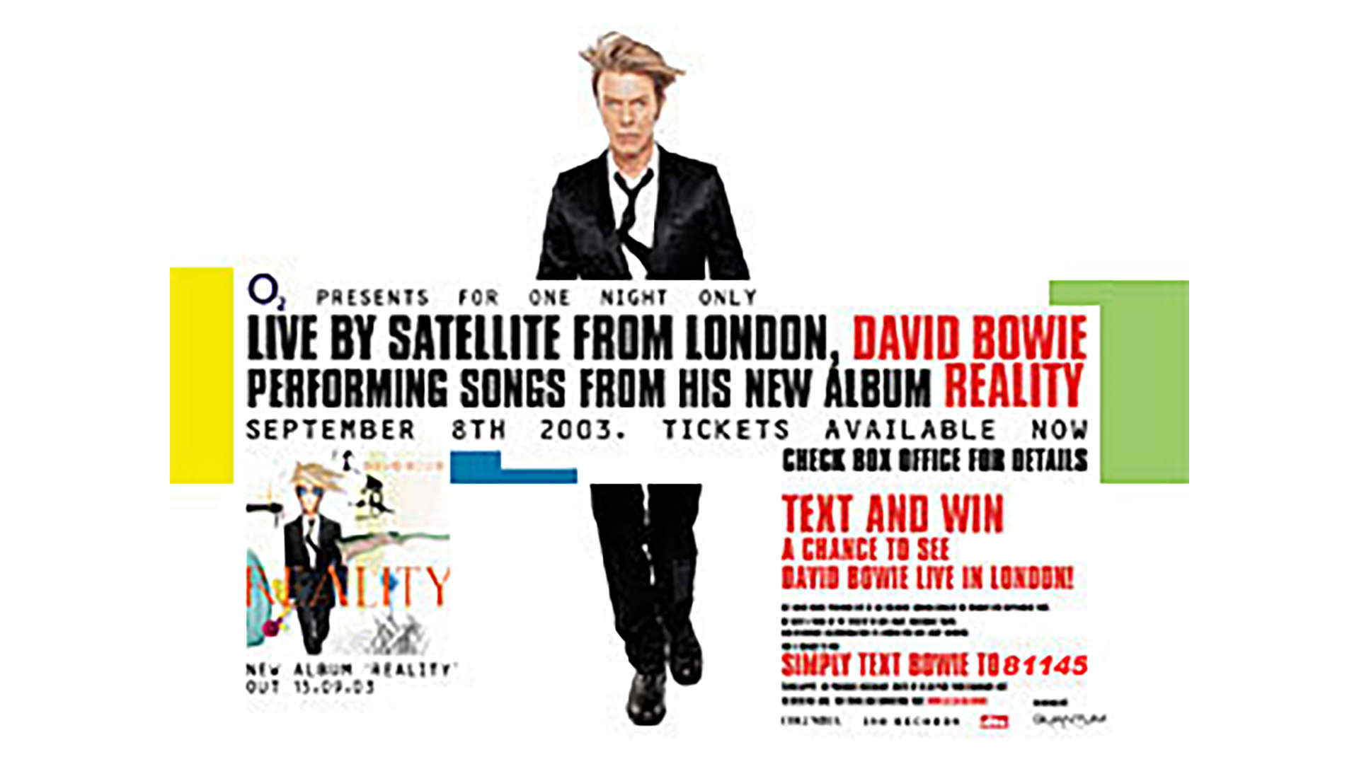 Το 2003 ο θρυλικός David Bowie έγραψε ιστορία, εγκαινιάζοντας μια νέα εποχή στη ζωντανή μουσική εμπειρία. Πραγματοποίησε την πρώτη διαδραστική συναυλία που μεταδόθηκε μέσω δορυφόρου σε 21 κινηματογράφους σε όλο τον κόσμο, δίνοντας τη δυνατότητα στους θαυμαστές του να βρεθούν πιο κοντά του, έστω και από απόσταση.